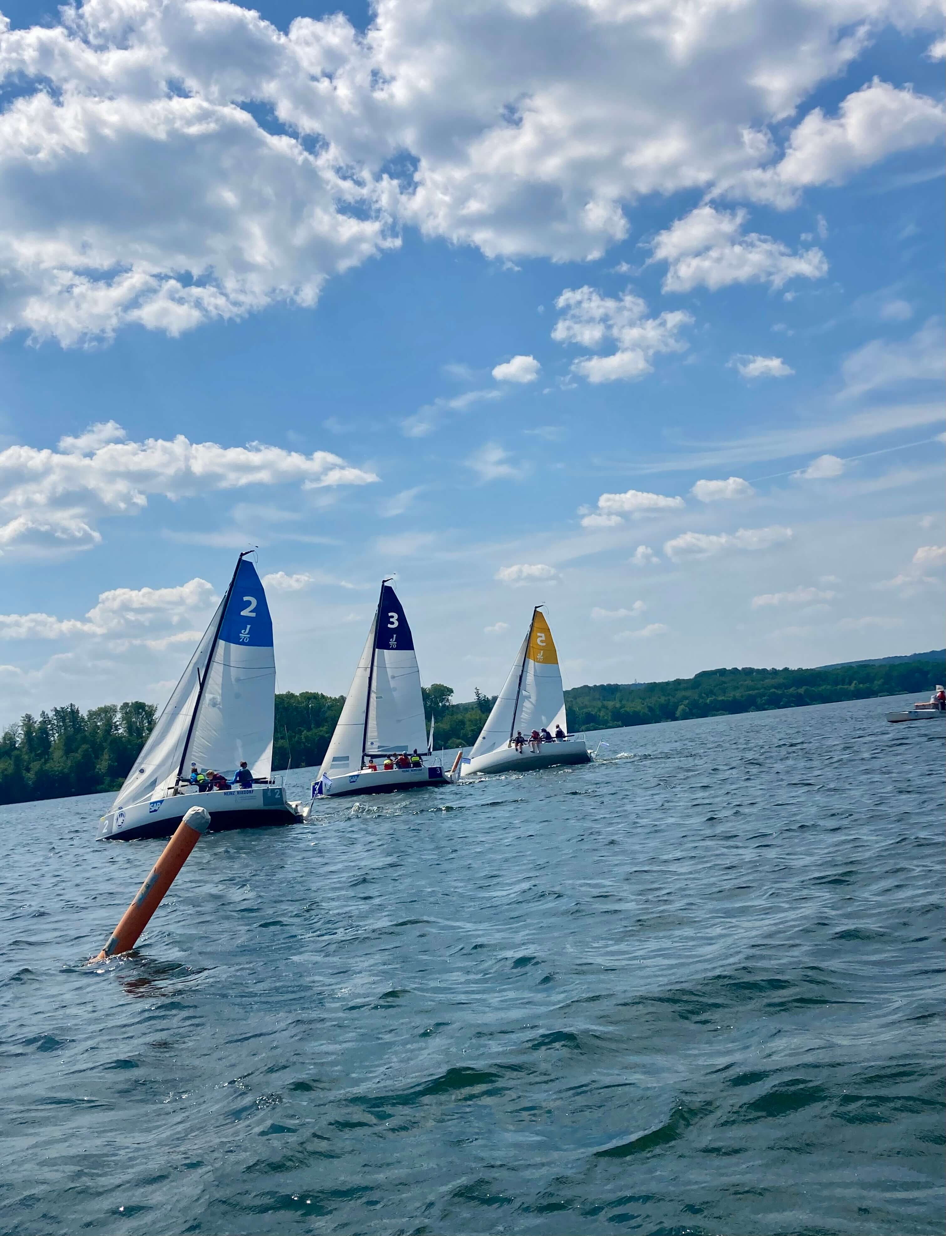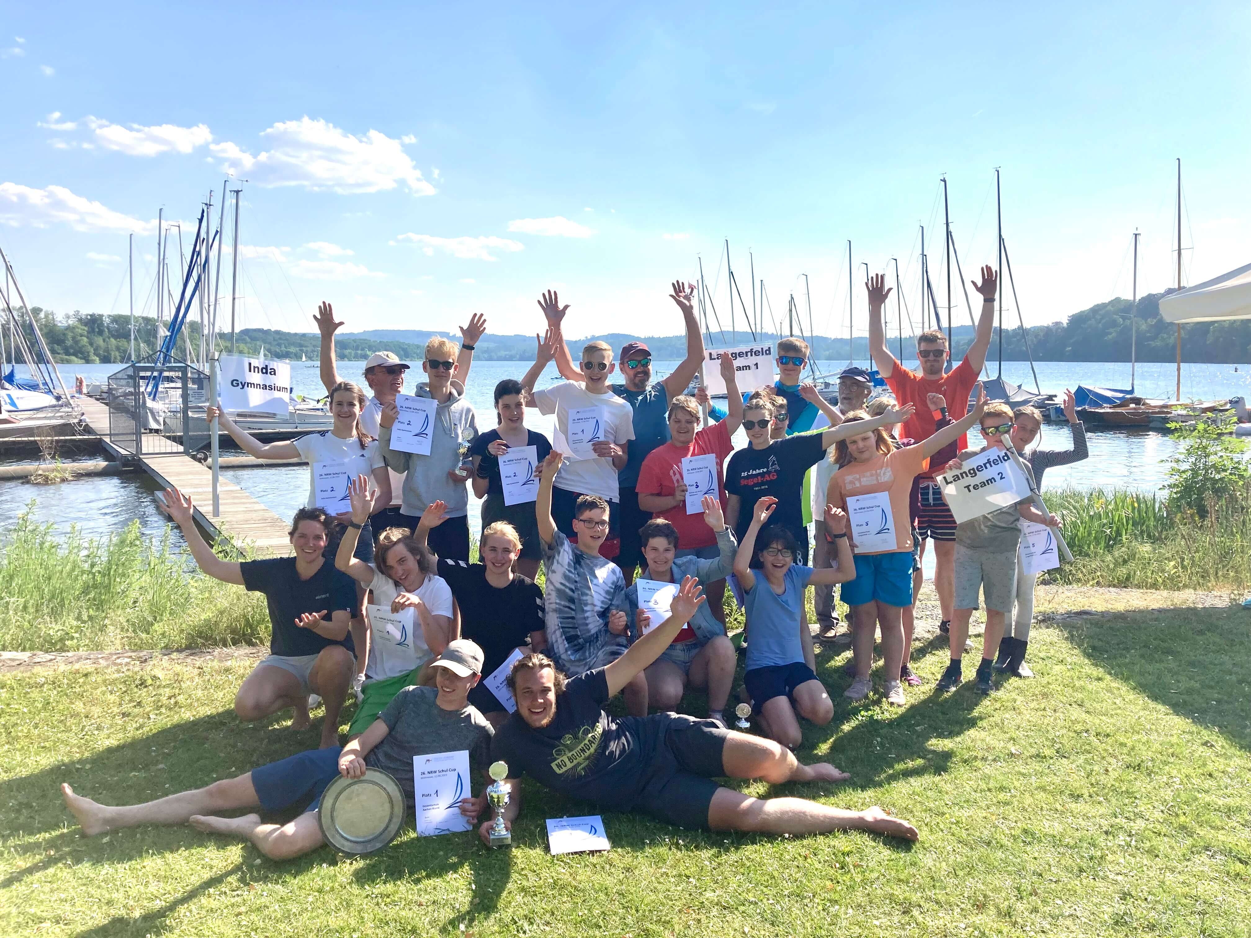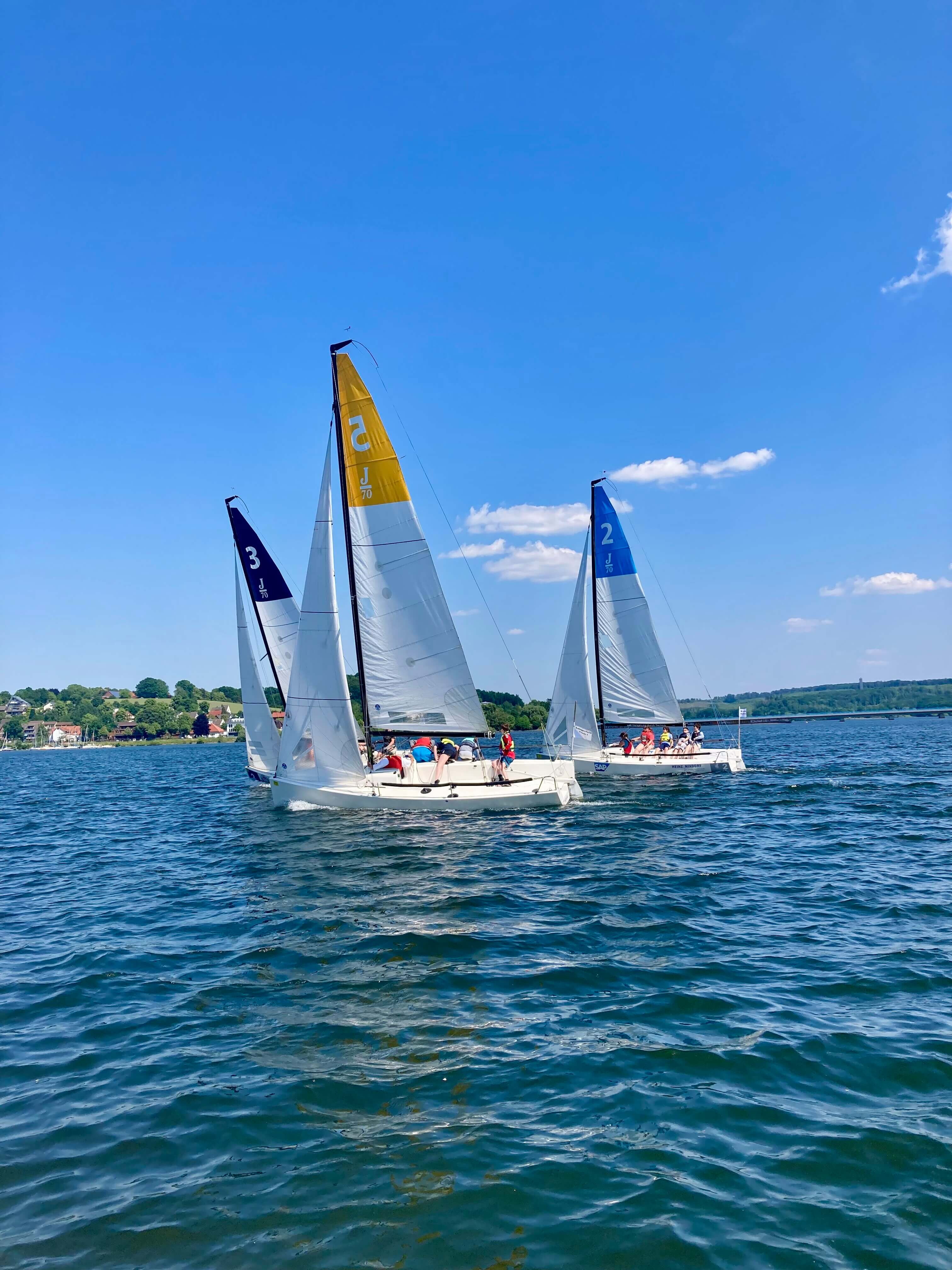 5 Teams aus ganz NRW kamen zum Möhnesee, um bei traumhaftem Wetter an die 30 Grad und konstantem Ostwind um die Schulmeisterschaft zu segeln. 4 Schüler*innen einer Schule bildeten ein Team. Mit an Bord war eine Lehrperson, die aber nicht aktiv ins Geschehen eingreifen durfte.