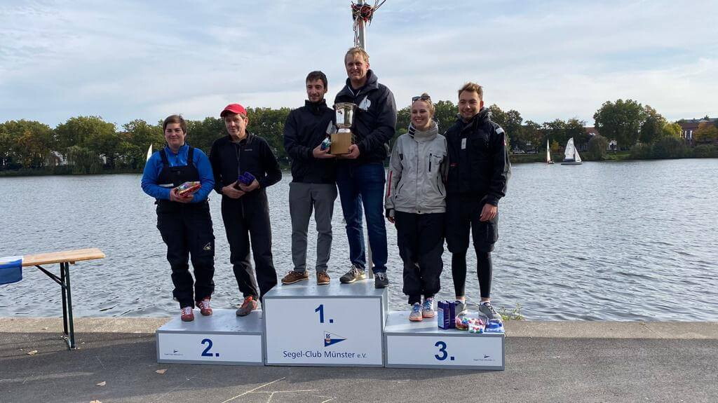 BU Die Sieger und Platzierten des Aasee Pokal light 2021: Tobias Call / Nick Houben vom ABC _Mitte- sichern und setzten sich mit nur einem Punkt Vorsprung gegen das zweitplatzierte Team Karsten Bredt / Svenja Thoroe HYC (Links) durch. Über den dritten Platz konnte sich unser SCM Team Frederik Nees / Rahel Schönwiese (rechts) freuen.