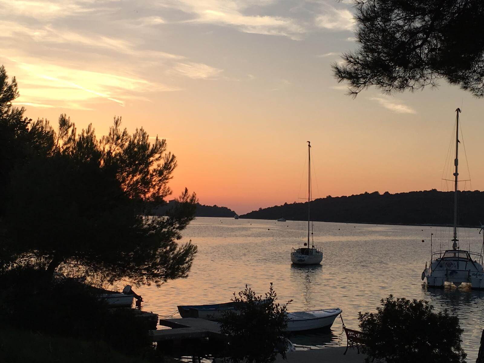1. Ziel, Cres auf der Insel Cres, 28 Seemeilen voraus. 8 Seemeilen schaffen wir unter Segel, danach entscheiden wir uns für einen Zwischenstopp in Medullin. In einer vorgelagerten Bucht gehen wir vor Anker und genießen ein erstes Bad in der herrlich warmen und klaren Adria. Die 1. Nacht verbringen wir an einer Boje im Hafen von Medullin und lassen den Abend in einem Restaurant an der Promenade ausklingen.