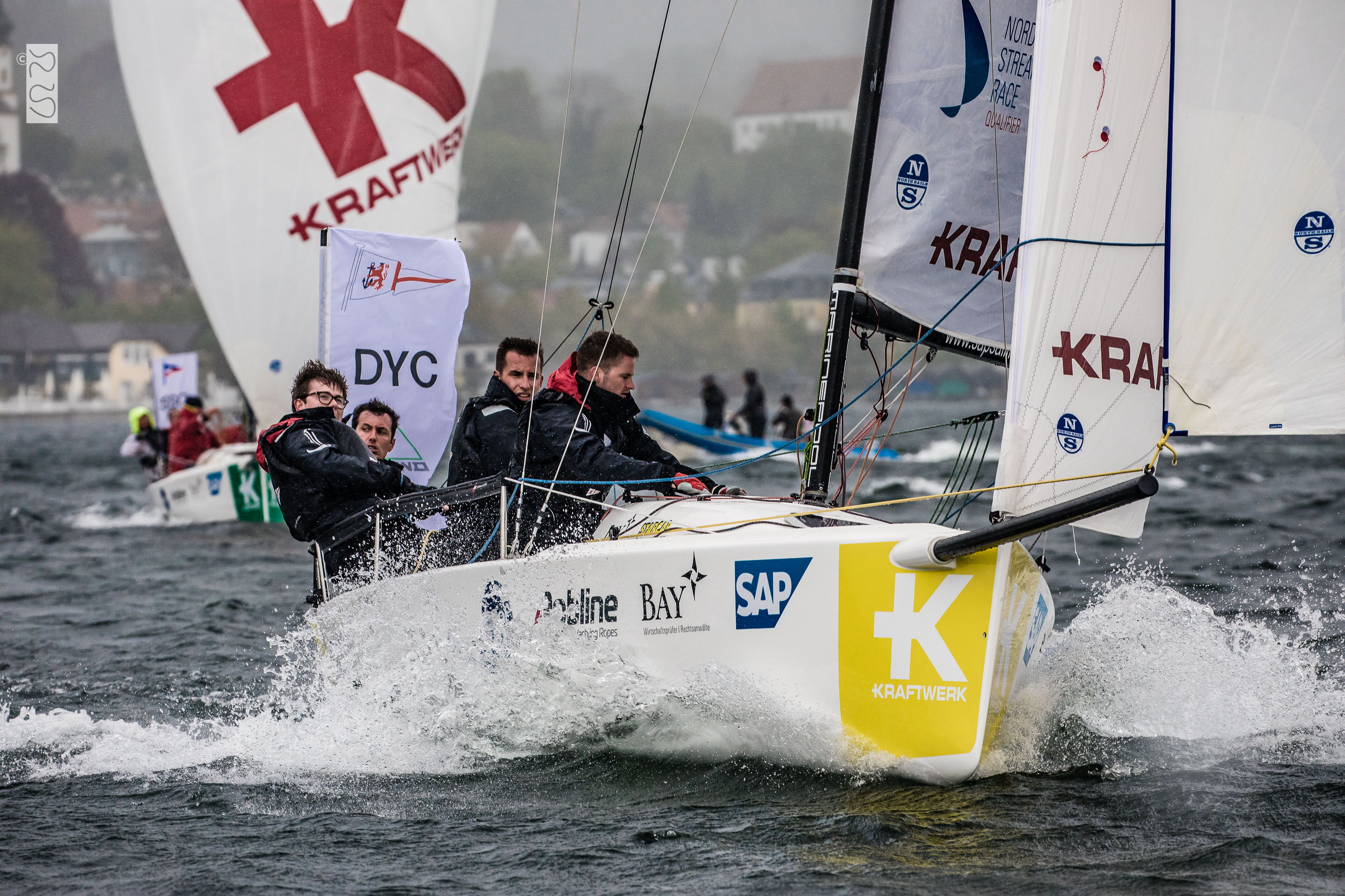 Die DYC-Manschaft segelt bei stürmischem Wetter auf dem Starnberger See bei der ersten DSBL-Regatta 2019 auf Platz vier. Copyright DSBL/Lars Wehrmann
