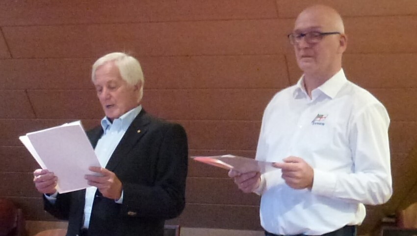 Man traf sich beim SKBUe und lauschte der Moderation von Ulrich Haase (rechts) und den Laudationes, die von Jürgen Hütter (links) formuliert und vorgetragen wurden. Zwischendurch ergaben sich interessante Gespräche in der Runde. Jeder Crew stand Frage und Antwort und erzählte das ein oder andere Erlebnis von der Reise.