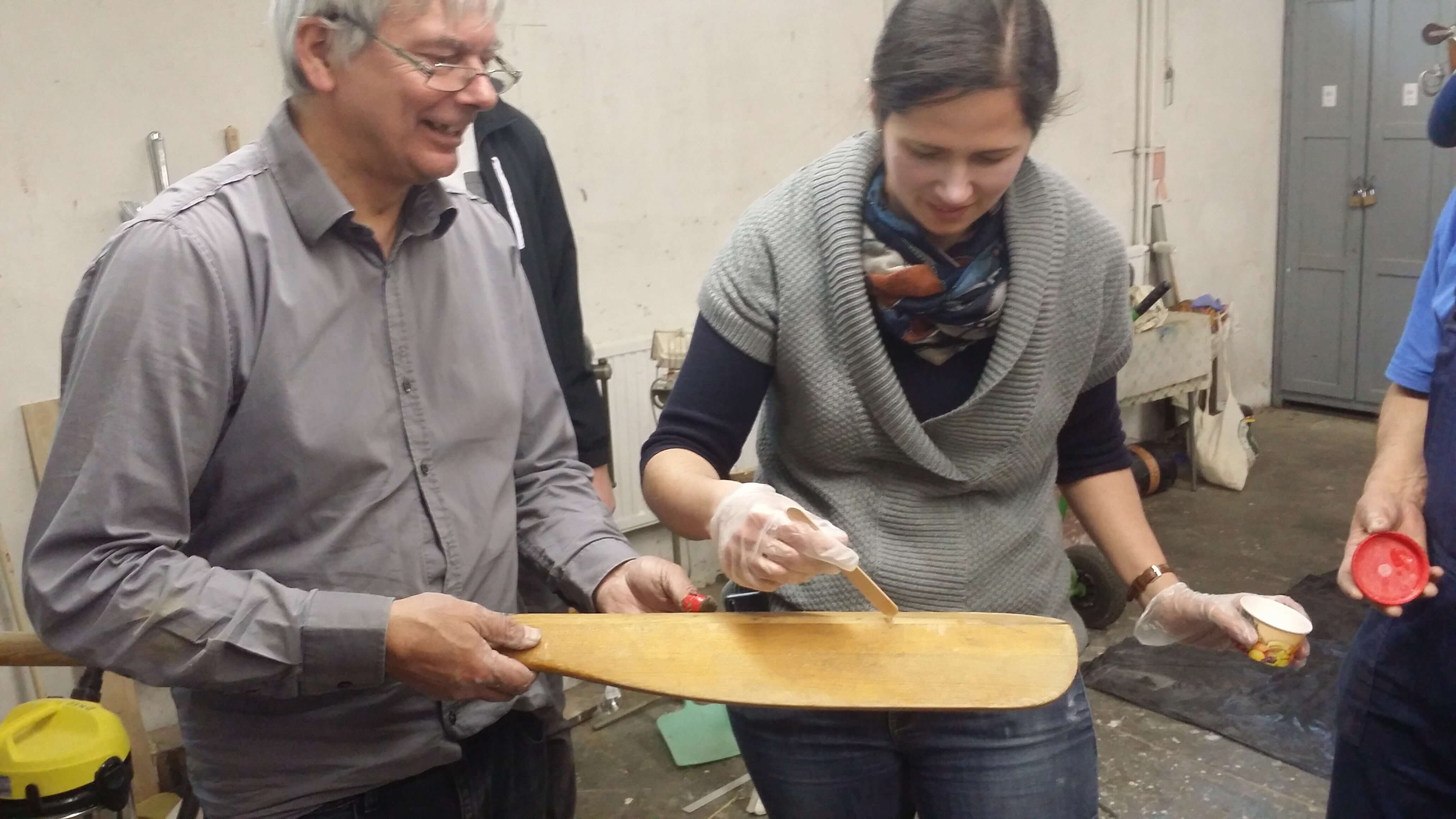 Zum Standardprogramm gehören außerdem Laminieren, GFK- und Epoxi-Reparaturen im Vergleich sowie Kleben, was beispielhaft an einem gebrochenen Paddel demonstriert wurde.