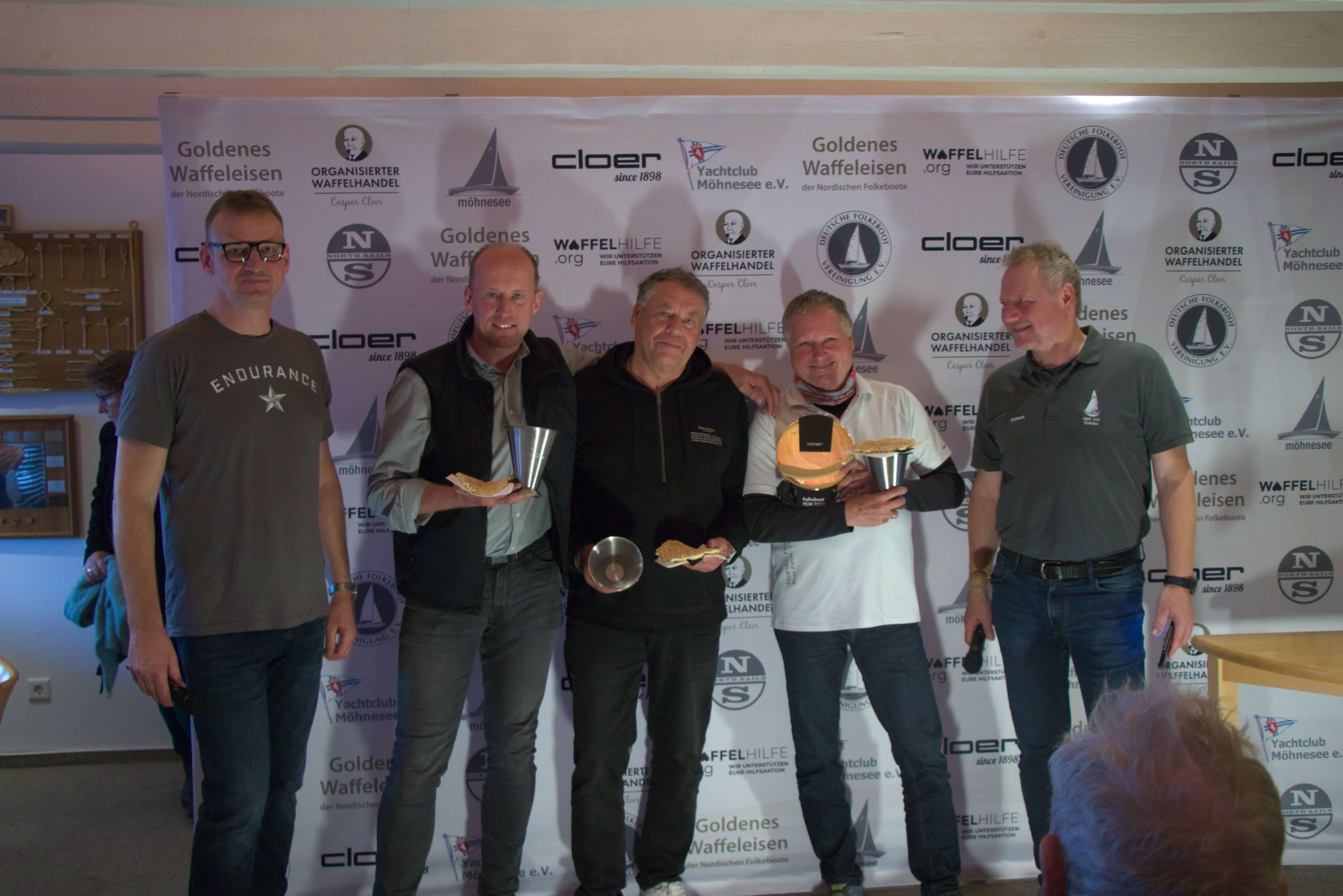 Den zweiten Platz belegte die Crew Andreas Hauf, Harald Busch und Claus Hörstensmeyer vom benachbarten Segelclub SKMD. Den dritten Platz erreichte die YCM-Crew Wilfried Sürth, Birgit Werthschulte und Arnd Ritter. Die Plätze eins bis drei erhielten aus dem Hause Cloer einen gravierten Messbesser, der unverzichtbar zum Anrühren von Waffelteig sei, so der Hauptsponsor. Verschiedene weitere Preise des Co-Sponsors North Sails wurden an die Platzierten vergeben. Gleichzeitig durften natürlich zur Preisvergabe die frisch gebackenen Waffeln nicht fehlen.