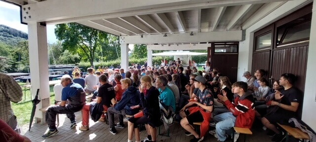 Doch nicht nur die Teilnehmerinnen und Teilnehmer hatten ihre Freude bei den insgesamt gesegelten vier Wettfahrten. Auch die Gäste, die auf den Schiffen der Rurseeschifffahrt als Passagiere unterwegs waren, hatten ihre helle Freude. Denn ihnen bot sich ein fantastischer Blick auf das Regattafeld. Insbesondere als viele Boote auf dem Weg zur Leetonne C in Höhe des Segelclub Jülich mit gesetzem bunten Spinnaker unterwegs waren, bewegte dieses fantastische Bild viele zum Zücken der Handys, um den Moment einzufangen. Überhaupt war die „Woffelsbacher Platte“ auf dem Rursee von den Regattaseglerinnen und -seglern dicht bevölkert, Ein großer Dank gilt daher den Kapitänen der Ausflugsschiffe, die routiniert, rücksichtsvoll und mit großem Geschick durch die Regattafelder manövrierten.