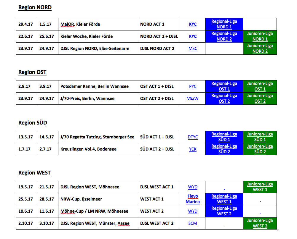 Wie nun die Regionalligen und auch die regionalen Junioren-Ligen funktionieren sollen hat der DSL e.V. zusammen mit der J/70 Klassenvereinigung in einem Gemeinschaftsprojekt besprochen. Auf Seiten der KV wird es jedoch für 2017 noch als Experiment betrachtet, da man den Einfluß auf die Kultur in der Klasse und der Einhaltung des Regelwerks der KV und des Rulebooks des World Sailing auf den Bahnen mit kritischem Auge beobachten will. Nicht zuletzt gibt es erhebliche Unterschiede in den Regeln des Liga- und des Klassen-Segelns auf den J/70 Booten.