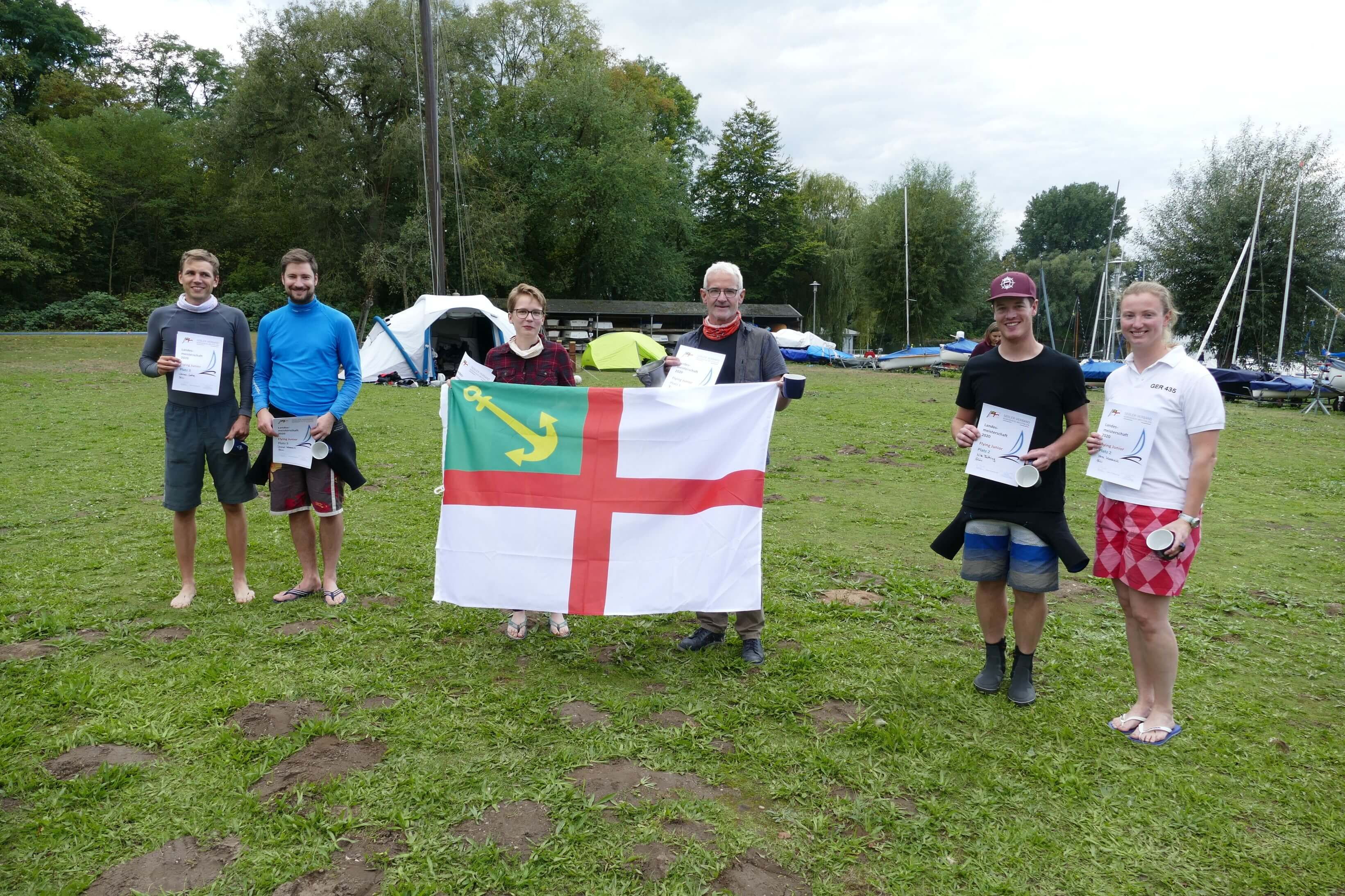 Bernd Hater und Paula Scharf verteidigten ebenfalls souverän ihren zweiten Platz vom Vortag. Als bestes deutsches Boot gewinnen die beiden damit den Friedel-Heinen-Gedächtnispreis und gleichzeitig die Landesmeisterschaft NRW im Flying Junior 2020. Nils Rüthing und Vera Kossack werden Vize-Landesmeister und auch sie behaupteten ihre Platzierung des Vortages. Jonas Jathe und Daniel Kossack, beide ebenfalls vom Segelclub Lippstadt, belegten im Rahmen der Landesmeisterschaft Rang drei.
