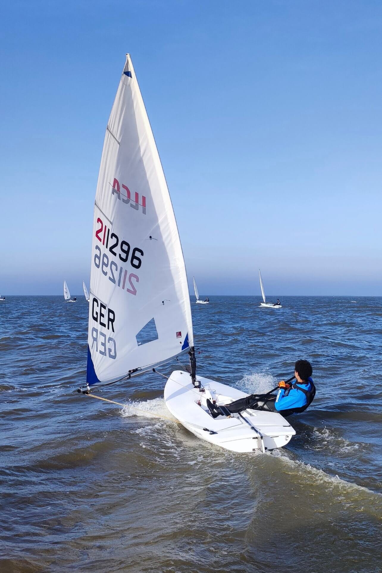 Am zweiten Tag des Trainings weht der Wind mit gut 17 Knoten aus Ost. Die durchziehenden Böen von bis zu 27 Knoten fordern die Segler zu Konzentration, Achtsamkeit und der ständigen Bereitschaft, das Boot voll auszureiten. Die wiederum fünf Trainingsgruppen (2x ILCA und 3x Opti) schließen sich bei den herausfordernden Bedingungen zum Teil für gemeinsame Trainingseinheiten und Läufe zusammen und können so auch die hin und wieder gekenterten Boote ausreichend unterstützen.