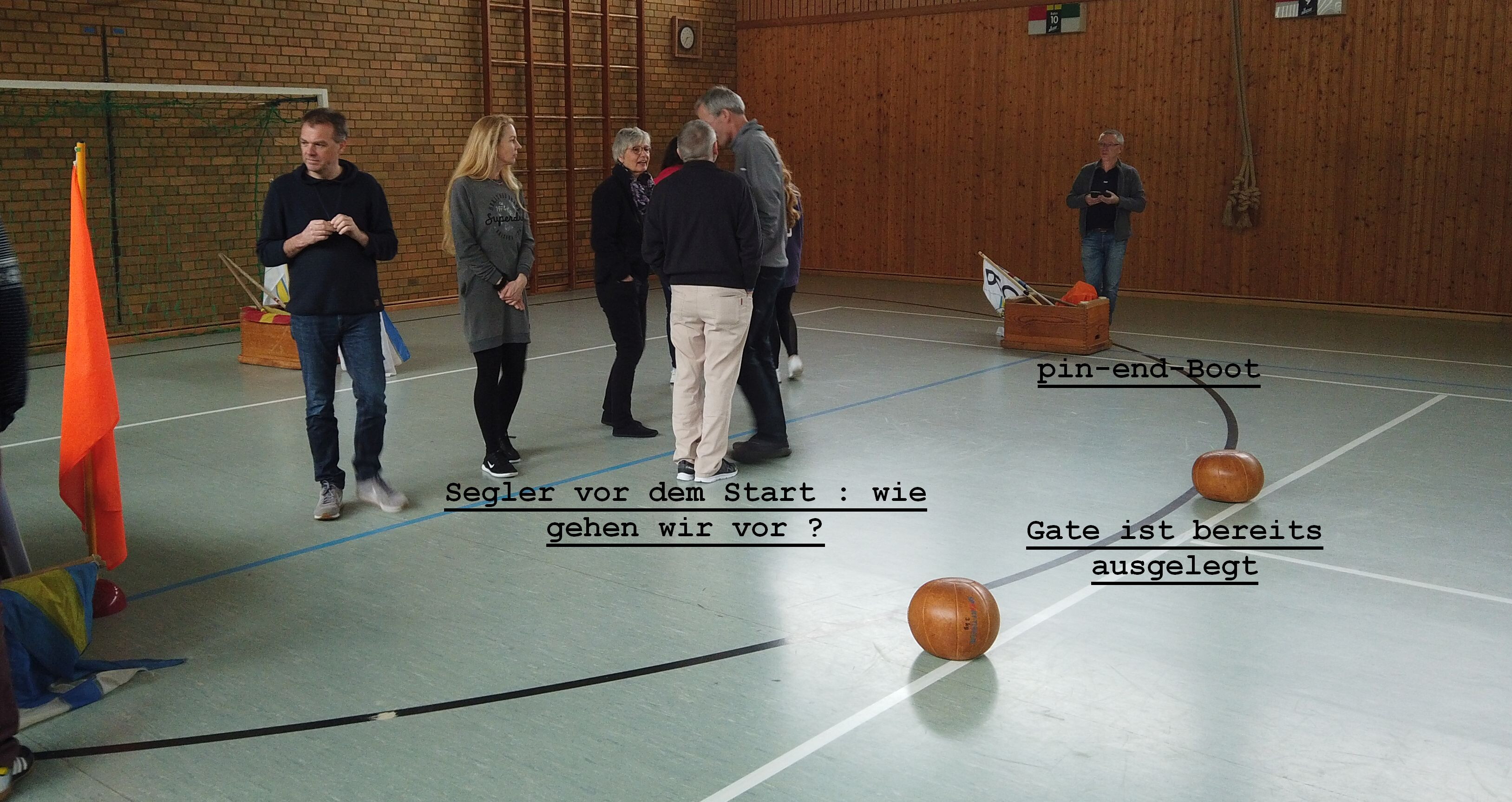 Die Teilnehmer wurden in „Funktionäre“ und Regatta-Teilnehmer eingeteilt, und dann gings es los. Natürlich hatten wir auch „Wind“ (Wolfgang Jentsch) in der Halle, leider genauso launisch wie im realen Leben: mal stetig (in) West, mal drehte sich der „Wind“, was eine Bahnänderung zur Folge hatte; oder er ging - einfach - weg: Abbruch!