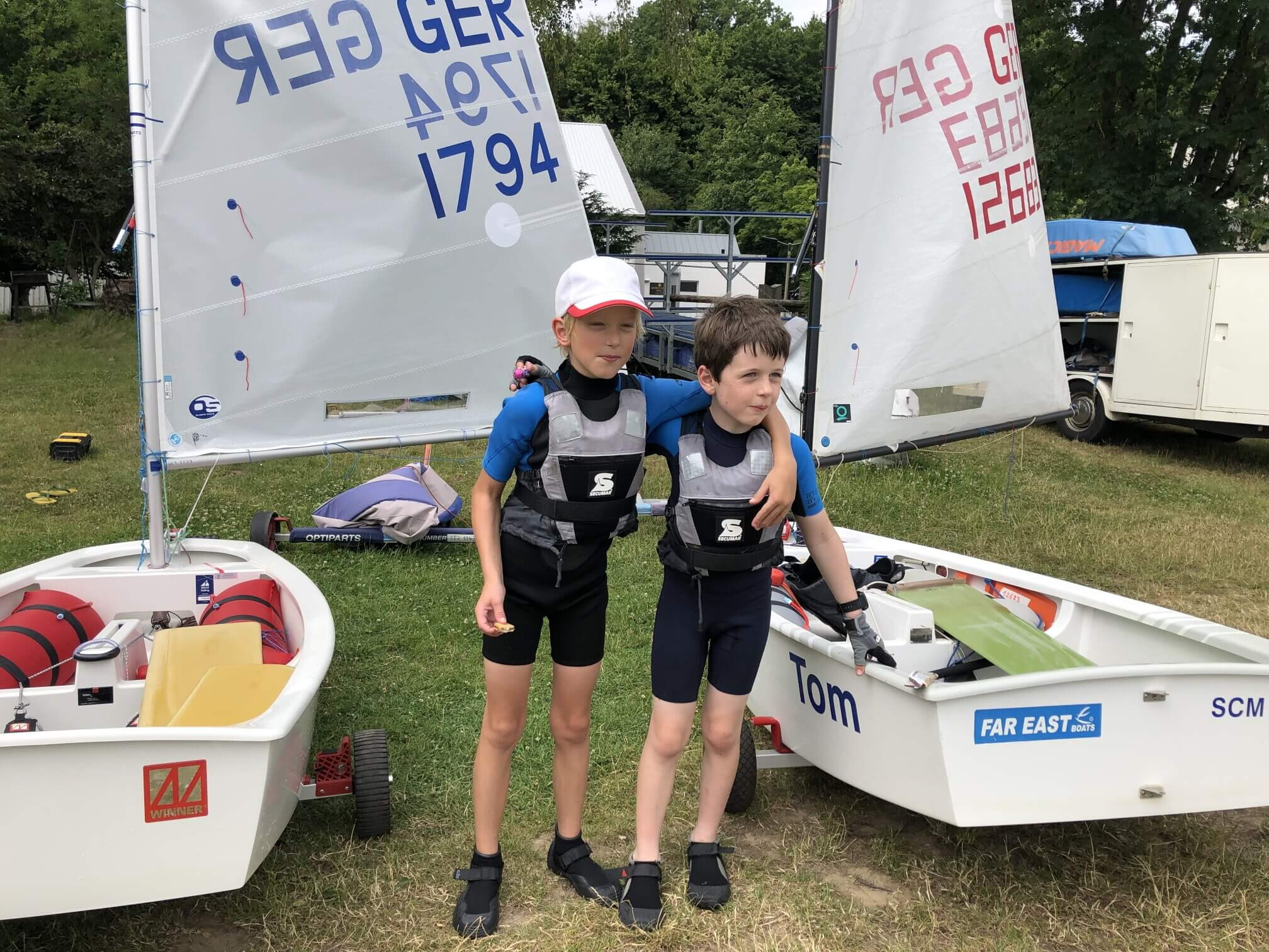 Der krönenden Abschluss gelang dem Duo um Tom Winkelmann (8) und Julius Unger (8) jedoch am letzten Wochenende in Essen auf dem Baldeneysee. Bei insgesamt 30 Teilnehmern in den Gruppen Opti A und B erreichten die Münsteraner Segler jeweils eine absolute Top Platzierung. Bei gutem Wind um 2-3 Beaufort segelten die jungen Münsteraner SCM Segler in Ihren Optimisten vier Läufe. Am Ende konnte Julius Unger die Regatta des ETUF klar für sich entscheiden. Mit den Plätzen 2/1/1/1 siegte er vor seinem Kumpel Tom Winkelmann, der ebenfalls mit einer beeindruckenden Serie von 1/2/2/2 den zweiten Platz erreichte. Das Siegerduo aus Münster kann sich mit dieser fulminanten Siegesserie glücklich in die bevorstehende Sommerpause verabschieden.
