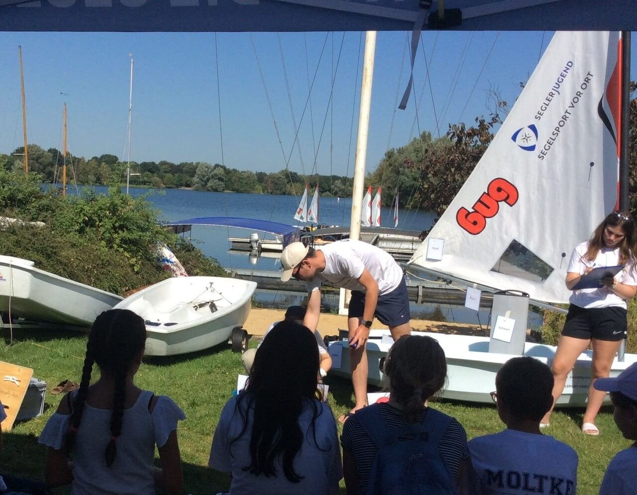 Ein Team lizensierter Trainerinnen und Trainer der DSV Seglerjugend war dafür bereits am Vorabend Sonntag 25.8. mit ihren Jollen und kompletter Ausrüstung an den Elfrather See gereist. Die Seglerjugend bringt bei diesem Konzept das gesamte Material wie z.B. Knotenbretter, Forschungsutensilien, Zeltüberdachung u.a. selbst mit. Unsere Aufgabe als Segelverein bestand im Vorfeld darin, interessierte Schulklassen und Kinder für die insgesamt drei Aktionstage Vor- oder Nachmittags zu gewinnen und für die Veranstaltung an den See zu bekommen.