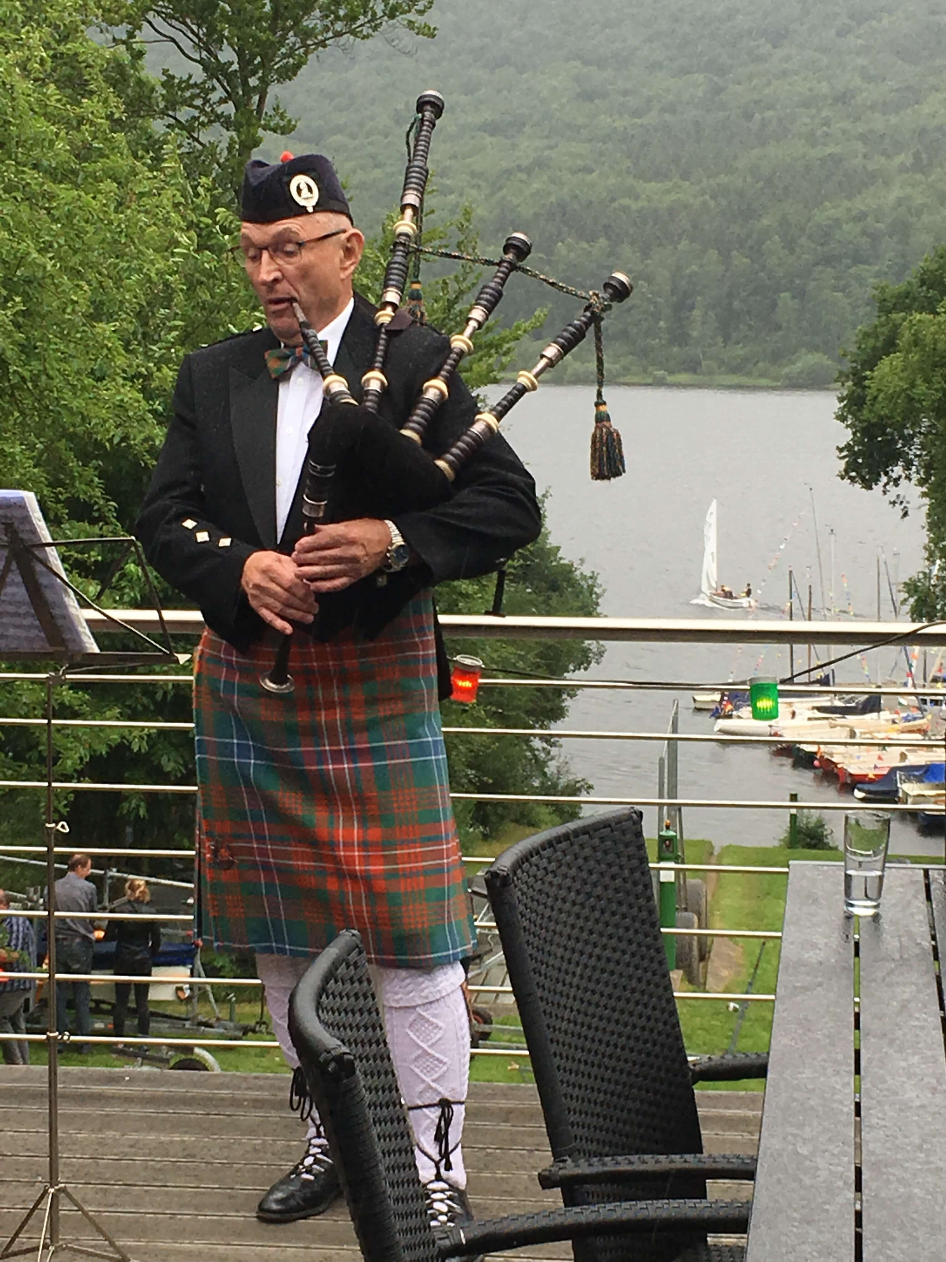 Das gemeinsame Abendessen wurde dann durch das Vereinsmitglied Manfred Clasen eingeleitet. Clasen war stilecht in schottischer Tracht gekleidet und spielte zur Begeisterung aller Anwesenden mehrere Stücke auf seinem Dudelsack. Plötzlich aufkommender starker Regen konnten den „Schotten“ dabei nicht aus der Ruhe bringen. Unermüdlich spielte er weiter, bis endlich ein Schirm organsiert war, der die komplette Durchnässung des Musikers samt Instrument verhinderte. Kaum war allerdings der letzte Ton verklungen, kam auch die Sonne wieder hervor, die den Jülicher Seglern nahezu den ganzen Tag hold geblieben war.