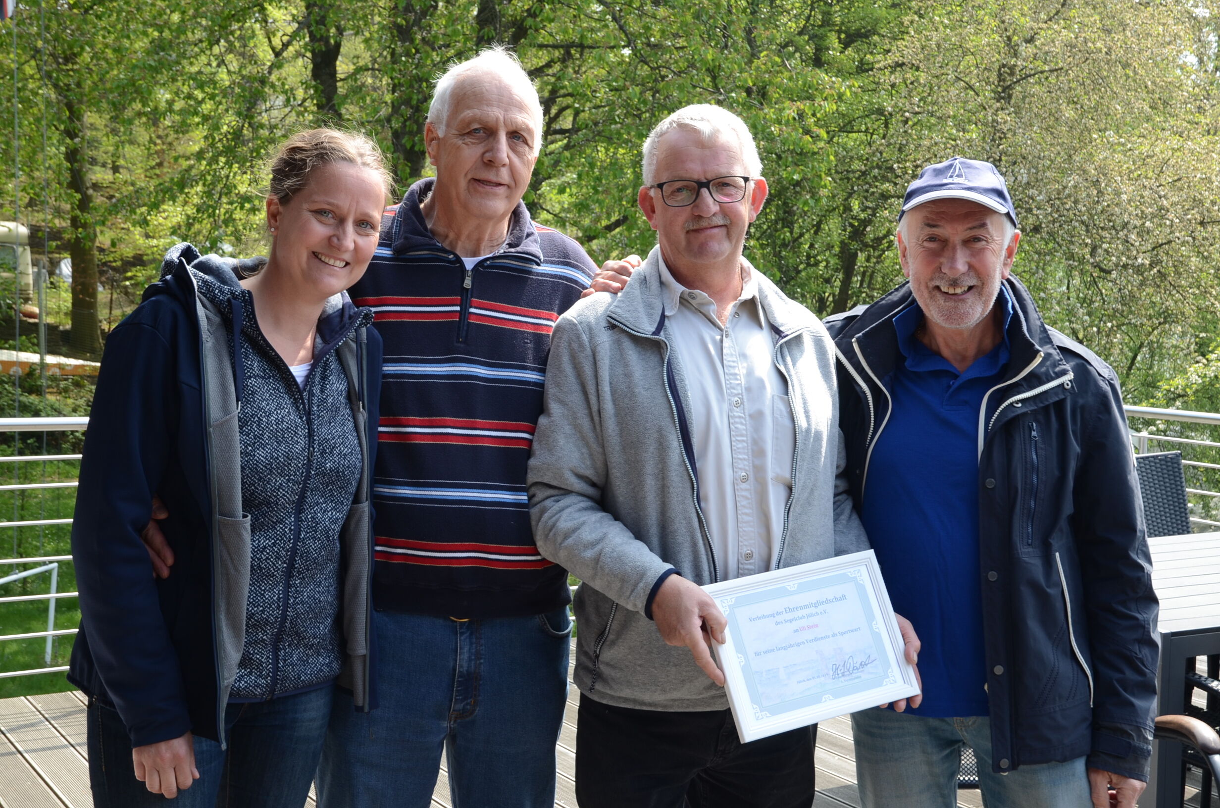 - das neue Ehrenmitglied Uli Stein (2. v.r.) nebest der neuen Regattawartin Lisa Hübner (ganz links), dem weiteren Ehrenmitglied Peter Ennen (2. v.l.) und dem ersten Vorsitzenden Hans-Jürgen Dännart (ganz rechts)