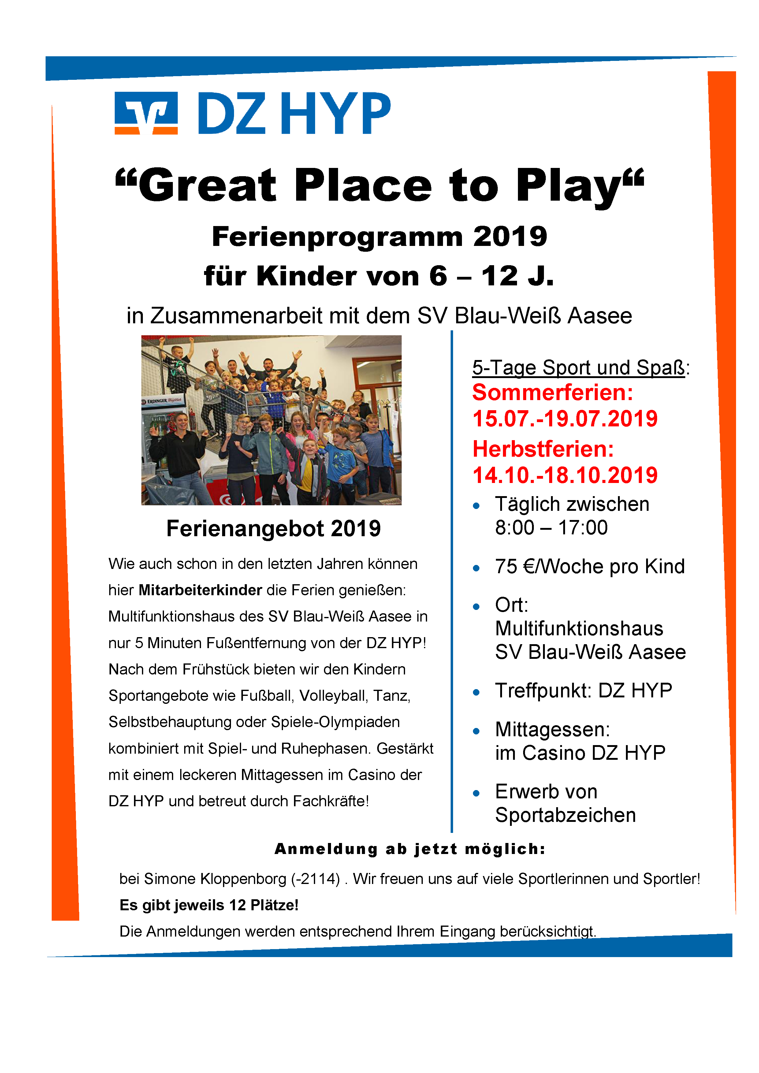 Auch im Jahr 2019 haben WestLotto und DZ HYP unter dem Motto "Great Place to Play" eine Kinderferienbetreuung angeboten. Den Kindern wird dabei eine breite Auswahl an sportlichen Aktivitäten und Spielen geboten, wobei auch die Chance besteht, Sportabzeichen zu erwerben. Mit Frühstück und Mittagessen im Casino der DZ HYP wird auch für das leibliche Wohl gesorgt. Tagsüber findet die Betreuung im Multifunktions-haus des SV Blau-Weiß Aasee, 5 Minuten von der Bank entfernt, oder z. B im Clubhaus des Segel Club Münster am Aasee statt.
