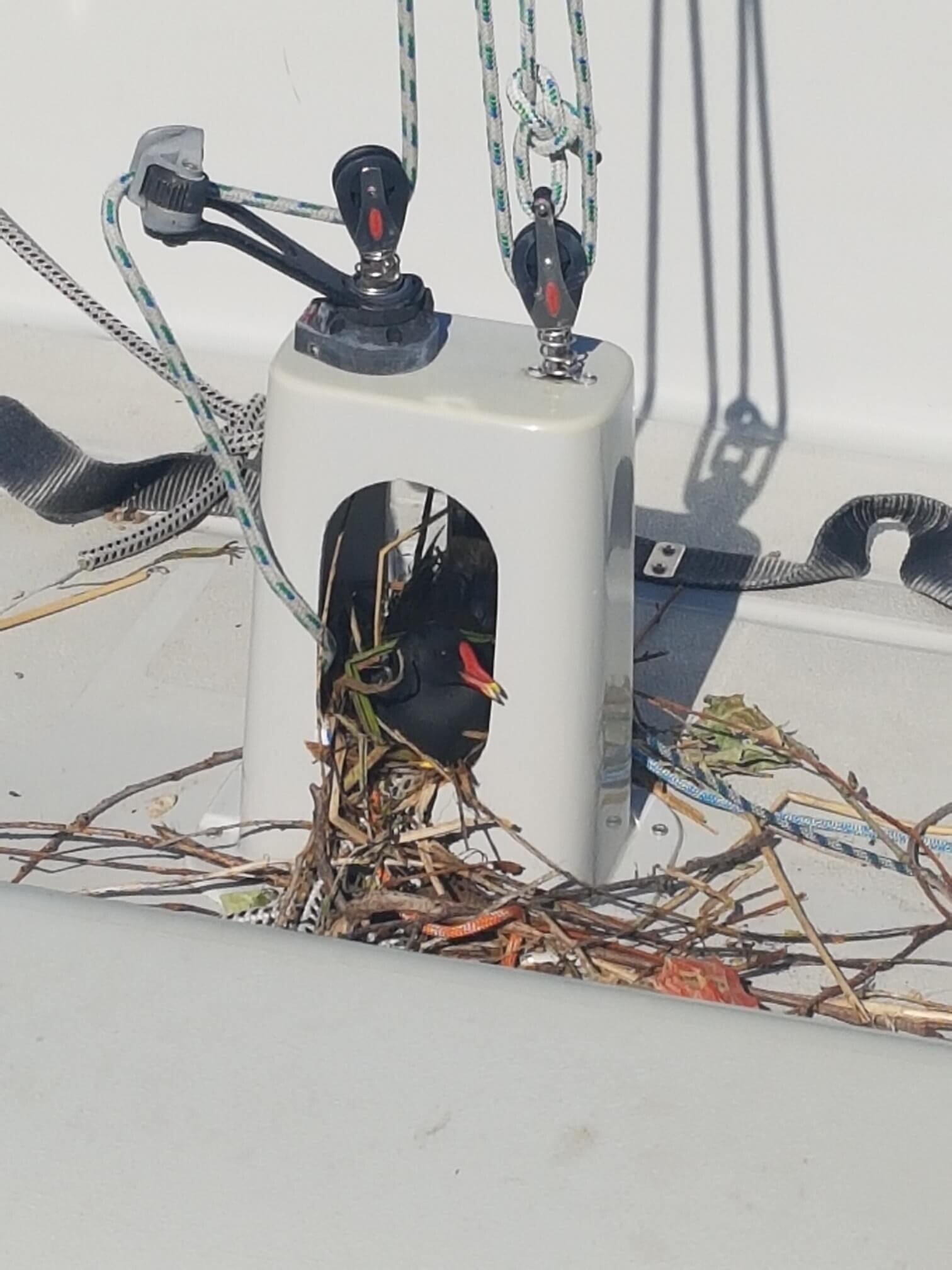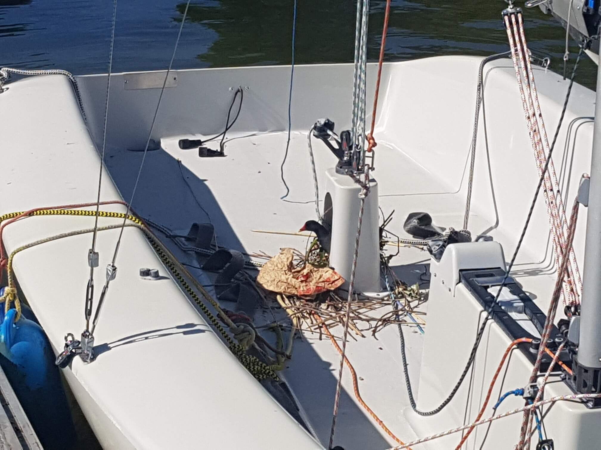 Die flotte Henne hatte sich in den wg. Corona gesperrten ruhigen Tagen unter dem Großschotpodest der „Aquarius“ ein hübsches Nest aus Treibmaterial gebaut und zwei gesprenkelte Eier hineingelegt. Pech für die SCM Segler und Glück für die Blässhuhn Familie.