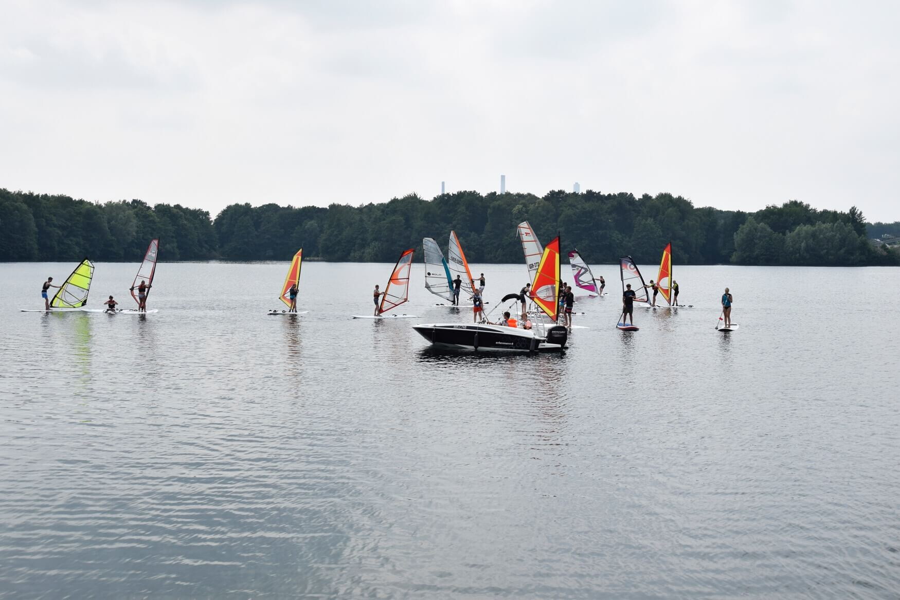 18 Teilnehmer kamen zum Tenderingssee, um unter der fachkundigen Anleitung der drei TVB-Trainer Jonas Kuhlmann, Daniel Bertram und Maximilian Schenzer ihre Windsurftechnik zu verbessern.